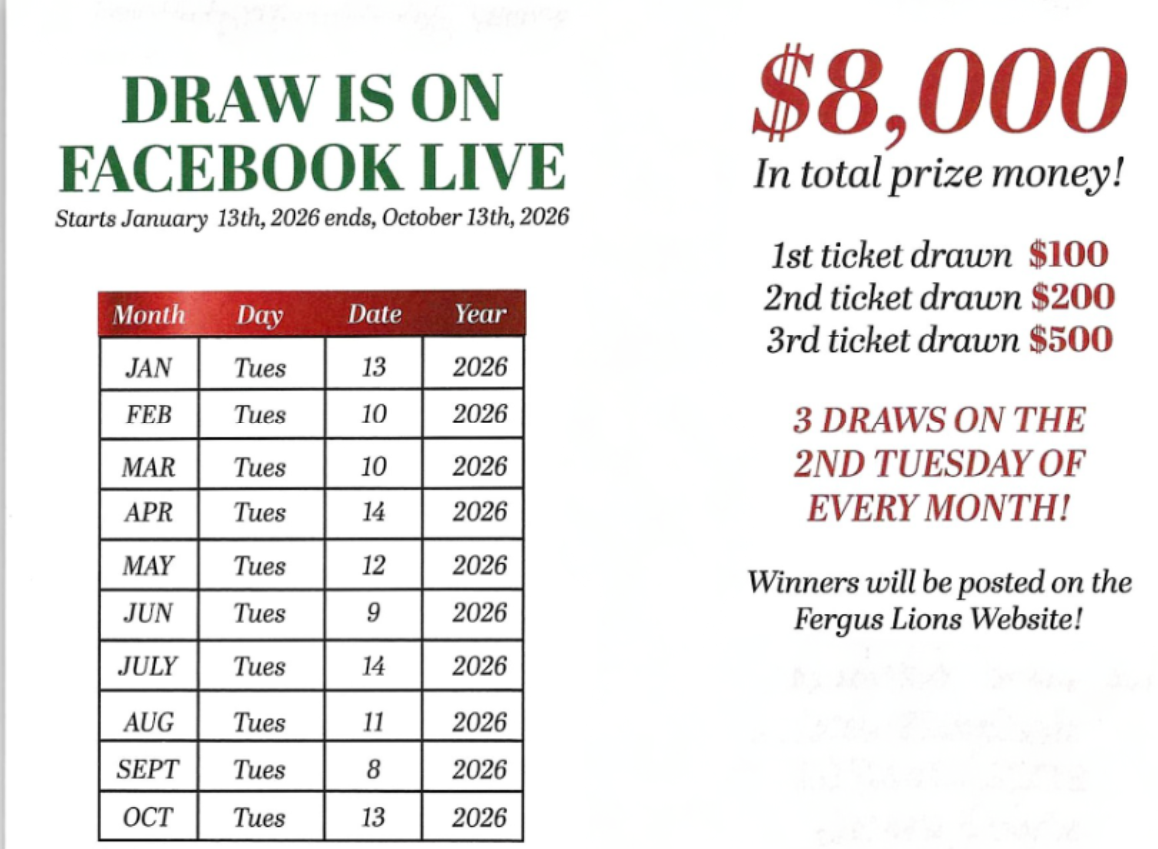 2026 tickets are available now from any Fergus Lion, or online. Starting October 24, 2025, we will be selling tickets at Zehrs or FreshCo (alternating weekends). Don’t miss out!