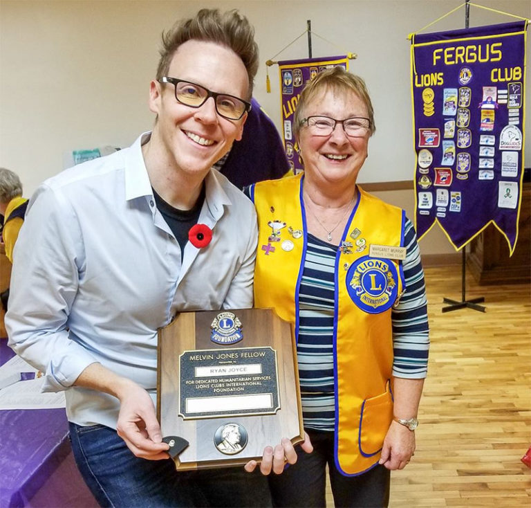 Ryan Joyce the world renown Magician who grew up in Fergus and attended CWDS before pursuing his career as a Magician. Ryan arranged shows at the Fergus Theater along with FLC members who sold tickets, provided Ushers and many other functions with The FLC receiving the profits from the Show to be used in Fergus and surrounding area. Ryan was invited to a Lions Dinner meeting and presented a Melvin Jones Fellowship which is the highest award a club can offer for anyone assisting Lions to carry out their goals in the Community.